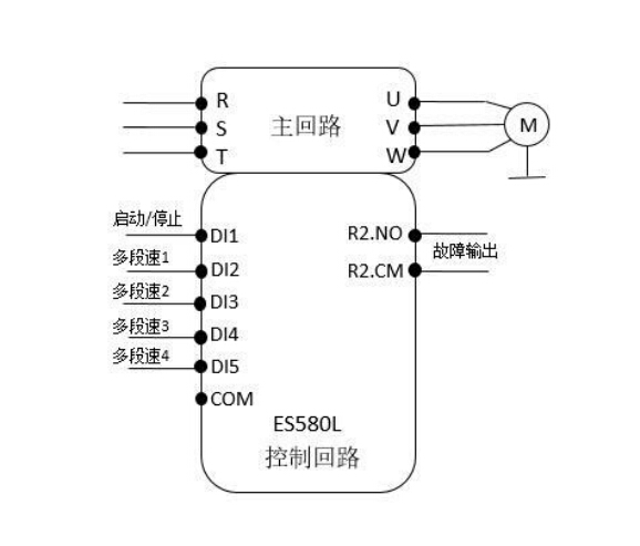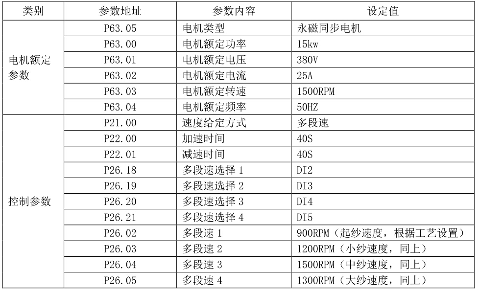 本方案采用 ES580L 驅(qū)動(dòng)器+永磁同步電機(jī)控制,根據(jù)細(xì)紗機(jī)工藝特點(diǎn),選擇多段速控制方式,即在起紗階段慢速運(yùn)行方面接頭;在小紗階段降低電機(jī)輸出轉(zhuǎn)速,可有效降低紗線斷頭率;在不易斷頭的中紗階段,提高電機(jī)輸出,增加產(chǎn)量;大紗階段適當(dāng)減少電機(jī)轉(zhuǎn)速以減小斷頭率,提高產(chǎn)品的質(zhì)量。