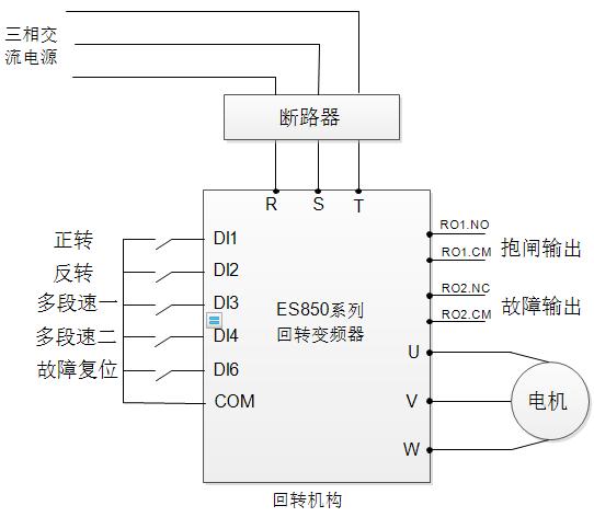 回轉(zhuǎn)部分采用 4kW 高性能矢量變頻器 ES850 系列,接線圖如下: