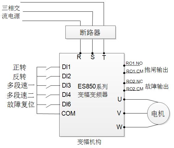 變幅部分采用 4kW 高性能矢量變頻器 ES850 系列,其系統(tǒng)接線圖如下: