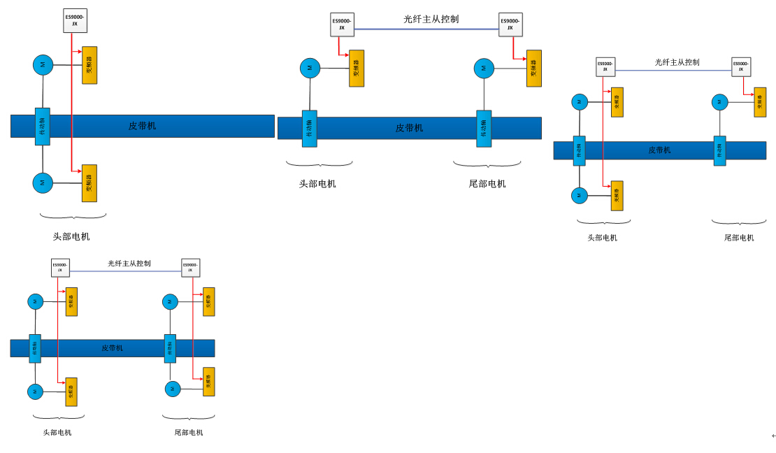 ES9000B/D皮帶機專用高壓變頻器采用變頻主從同步系統(tǒng)控制技術(shù),內(nèi)部采用光纖通訊、將多傳動變頻組成一個控制系統(tǒng),由ES9000-JX系列皮帶機專用集控箱自動調(diào)節(jié)各傳動工作狀態(tài),最終實現(xiàn)各傳動系統(tǒng)轉(zhuǎn)矩、功率、電流平衡,速度同步,保持皮帶正常運行,避免皮帶等設備因驅(qū)動不平衡引發(fā)設備事故。