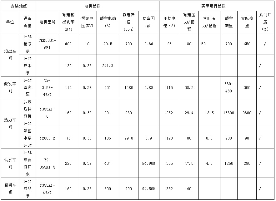 在對(duì)現(xiàn)場(chǎng)21臺(tái)風(fēng)機(jī)與泵類調(diào)研的基礎(chǔ)上,綜合考慮現(xiàn)有生產(chǎn)情況,對(duì)溶出車間1-3#精液泵、蒸發(fā)車間1-4#母液泵、熱力車間1-3#除鹽水泵和1-4#羅茨風(fēng)機(jī)、供水車間1#綜合循環(huán)水泵、原料車間1-4#成品泵進(jìn)行變頻節(jié)能改造,設(shè)備參數(shù)如下表: