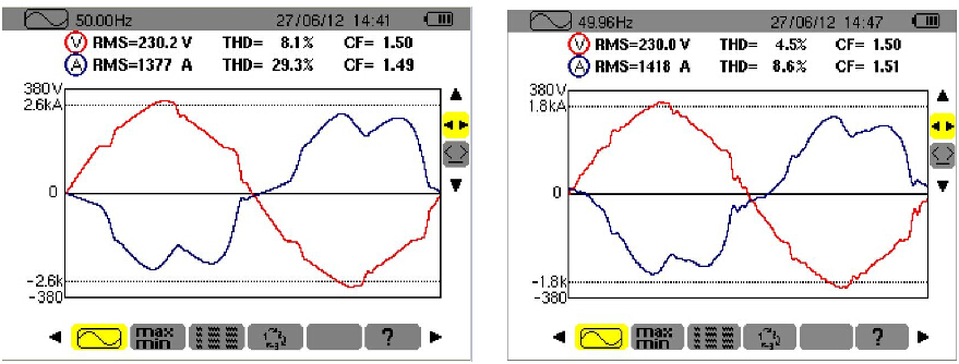 濾波器投入前(紅色電壓,藍色為電流) 濾波器投入后(紅色電壓,藍色為電流)