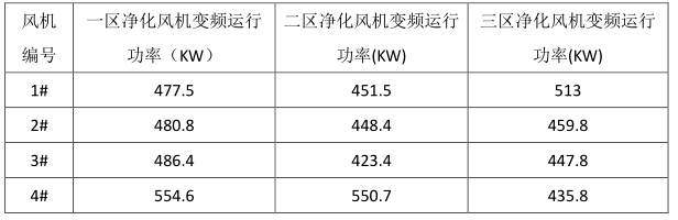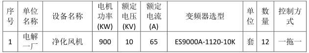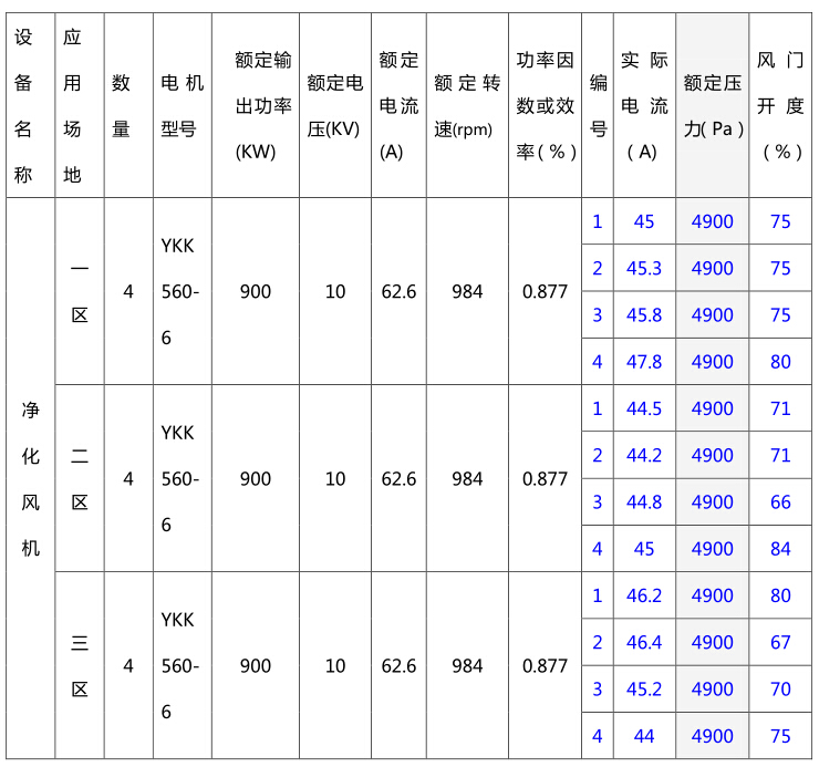 中國(guó)鋁業(yè)蘭州分公司電解一廠現(xiàn)有12臺(tái)900KW凈化風(fēng)機(jī),本次共有一區(qū)4臺(tái)煙氣凈化風(fēng)機(jī),二區(qū)4臺(tái)凈化風(fēng)機(jī),三區(qū)4臺(tái)凈化風(fēng)機(jī)進(jìn)行采用深圳市庫(kù)馬克新技術(shù)股份有限公司生產(chǎn)的ES9000高壓變頻器進(jìn)行變頻節(jié)能改造。根據(jù)現(xiàn)場(chǎng)踏勘了解到設(shè)備現(xiàn)有運(yùn)行情況如下表所示: