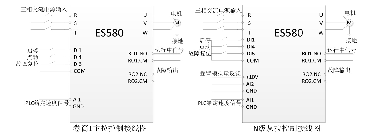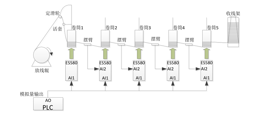 直進(jìn)式拉絲機(jī)主要構(gòu)成包括:放線輥、活套、拉絲模和卷筒、張力擺臂、排線設(shè)備和收線設(shè)備等幾部分。根據(jù)要生產(chǎn)線材的規(guī)格,在各道卷筒前面安裝相應(yīng)的拉絲模,拉絲模由大到小,最后一道拉絲模規(guī)格為所需產(chǎn)品線徑規(guī)格。鋼絲經(jīng)過放線設(shè)備通過活套進(jìn)入拉絲模及卷筒 1,由于活套可以自由打滑,因此卷筒 1 給定一個(gè)速度就行了,不需要 PID 調(diào)整。兩卷筒之間有張力擺臂,從卷筒 2 開始,變頻器會根據(jù)擺臂反饋信號作 PID 速度調(diào)整,以保證各個(gè)卷筒之間張力恒定。收卷方案比較多,一般采用速度 PID 收卷和張力收卷方案。